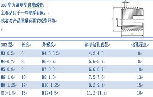 薄壁型南京自攻螺套外观上看主要有两种区分,一种是一端开槽型的,另一种是一端三圆孔型的,其中开圆孔型的又分为307型和308型两种,307型和308型外观主要区别就是同一直径下,长度和外径大小有所区分。以上各种型式螺套均具有自行攻牙功能。